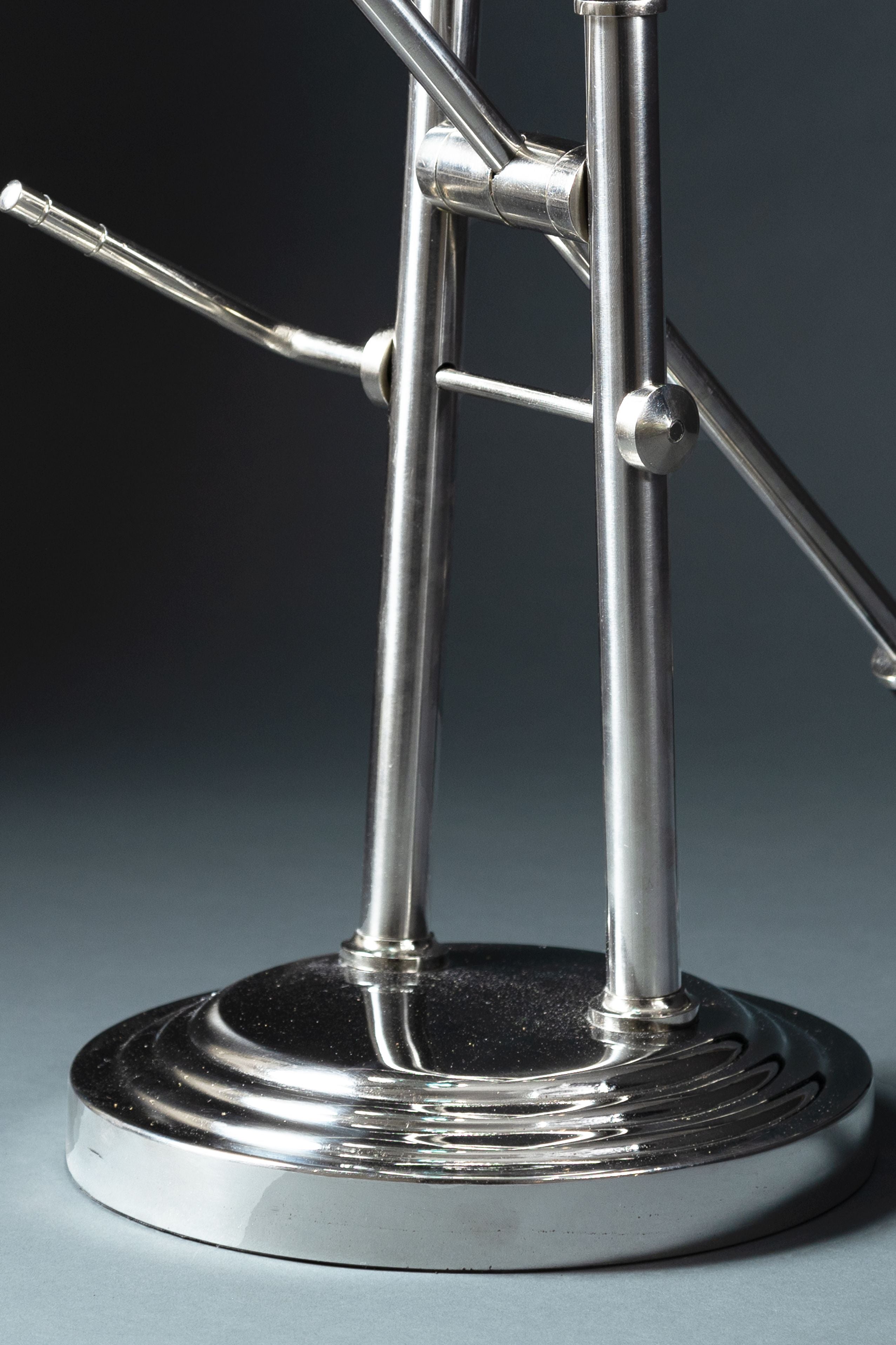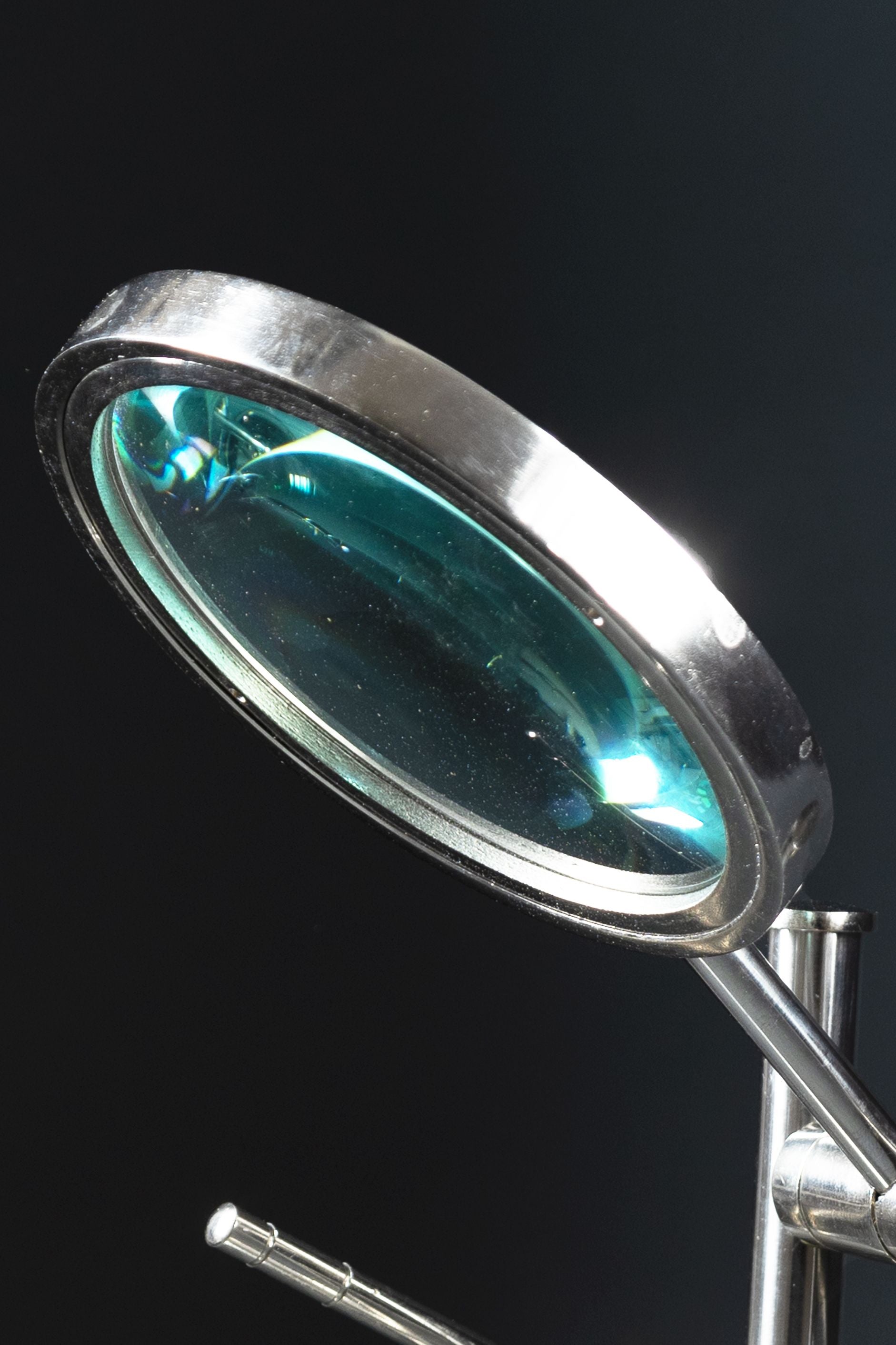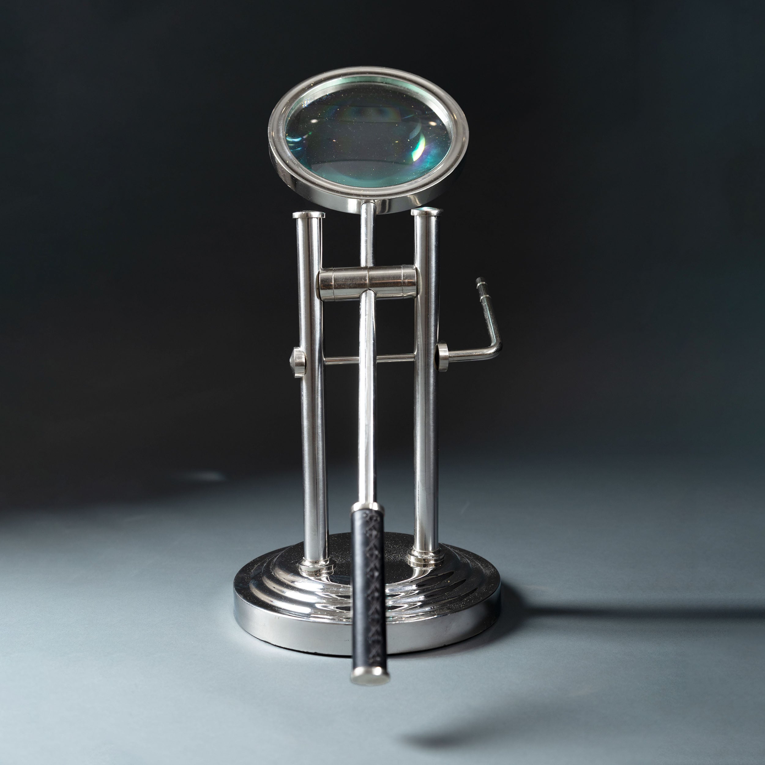 This Swedish Silver polished Desktop Magnifying glass is in Perfect condition. The finish gives it a sleek and modern look, The Magnifying glass has lovely leather stitching. The moveable lens are adjustable and allows you to zoom in on any object with ease.The magnifying glass is a great conversation piece. It's sure to turn heads wherever you put it.