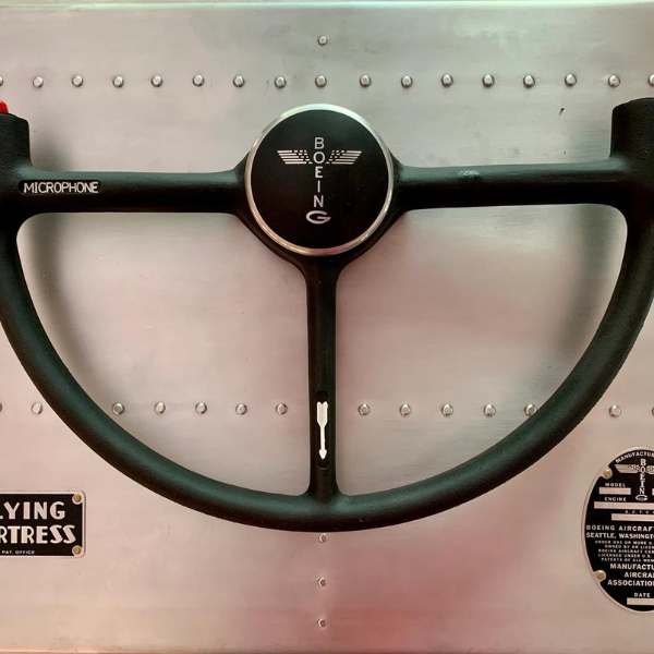 This WWII Boeing B-17 Flying Fortress Control Yoke is mounted on riveted aircraft aluminum with the original data plate and instrument panel placard. Straight from the restoration hanger this Command Pilot's Control Yoke is cast in solid aluminum and weighs in at a hefty 4 1/2 lbs. Measures 16" in diameter. Museum Quality. Not airworthy
