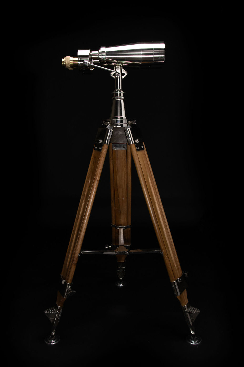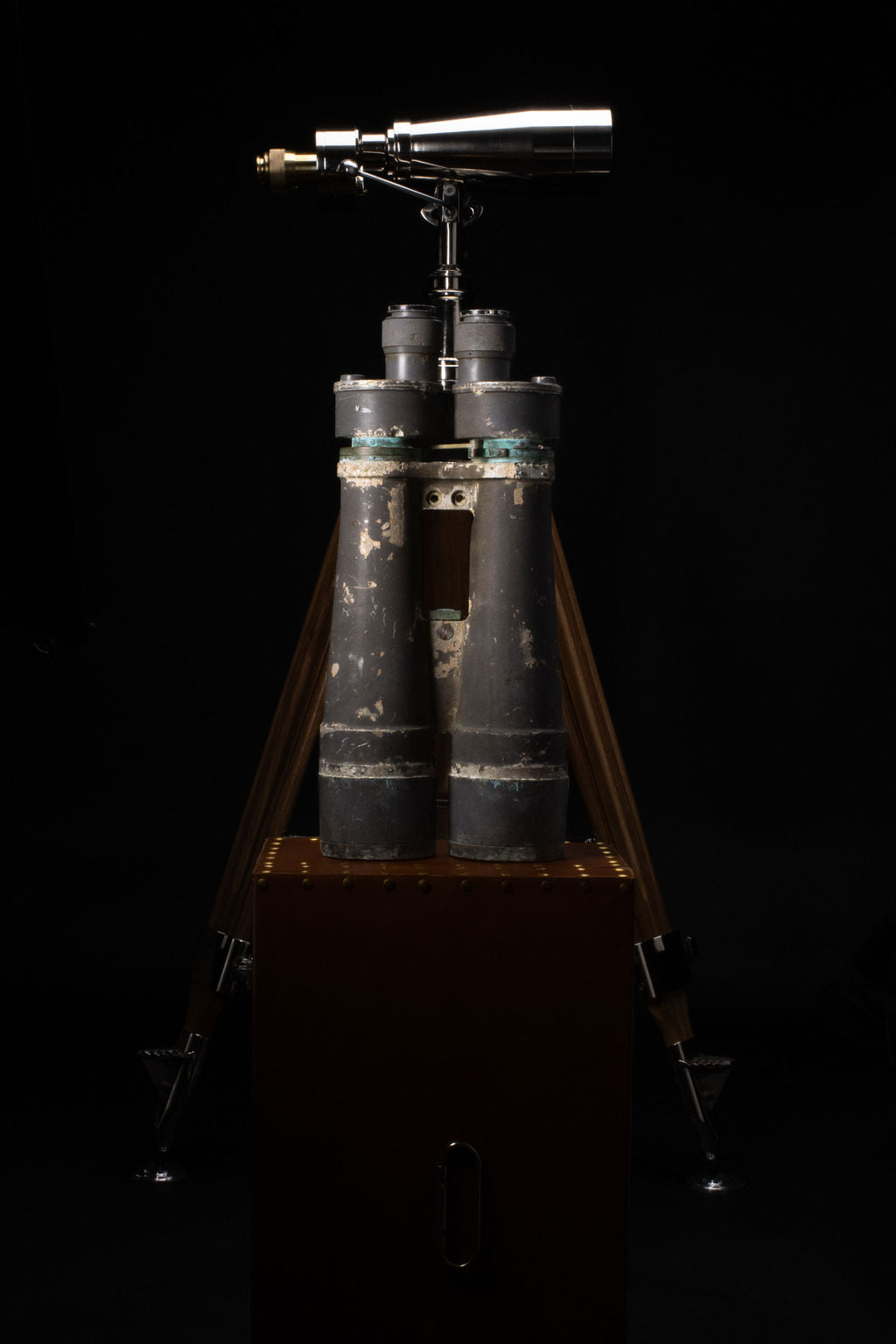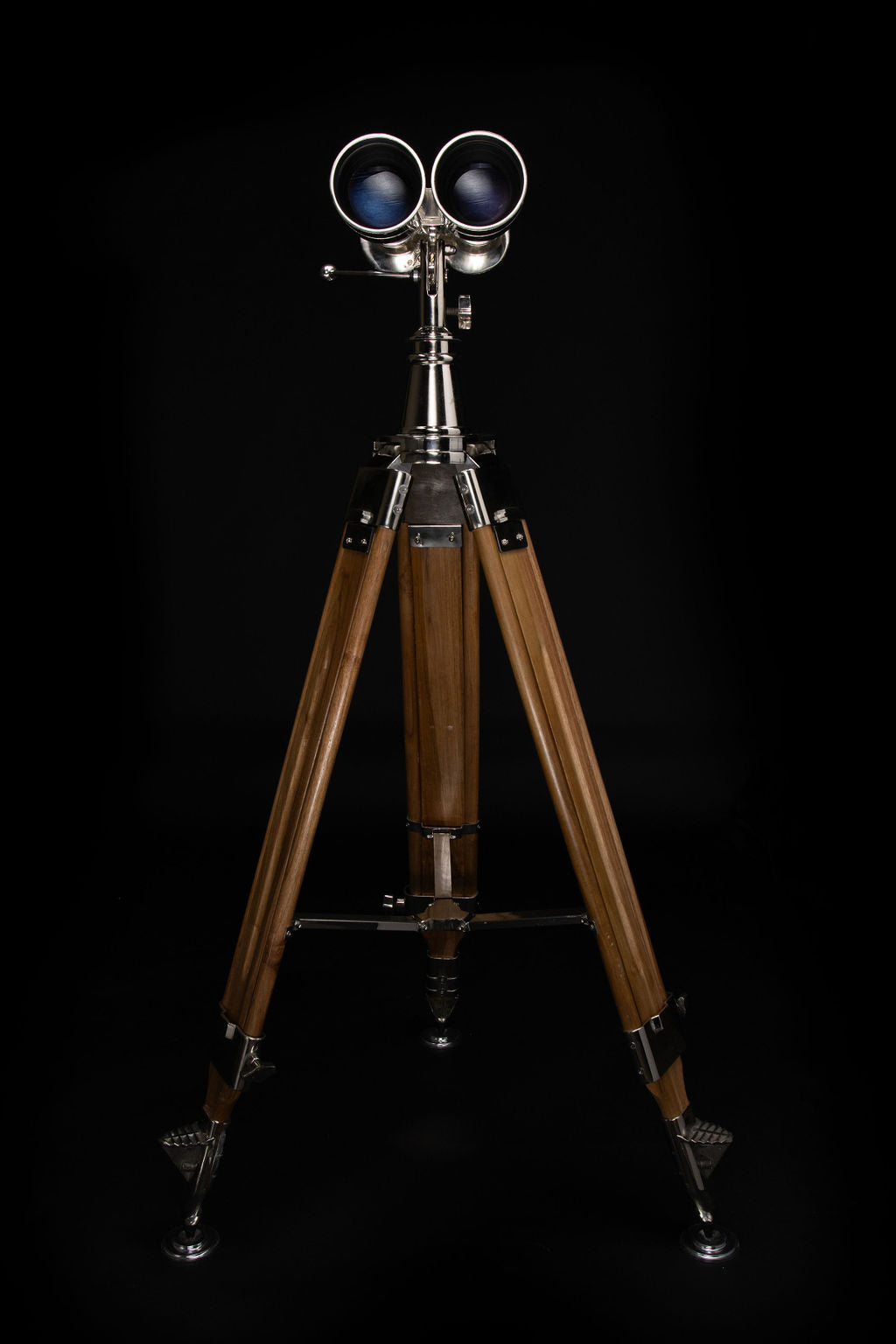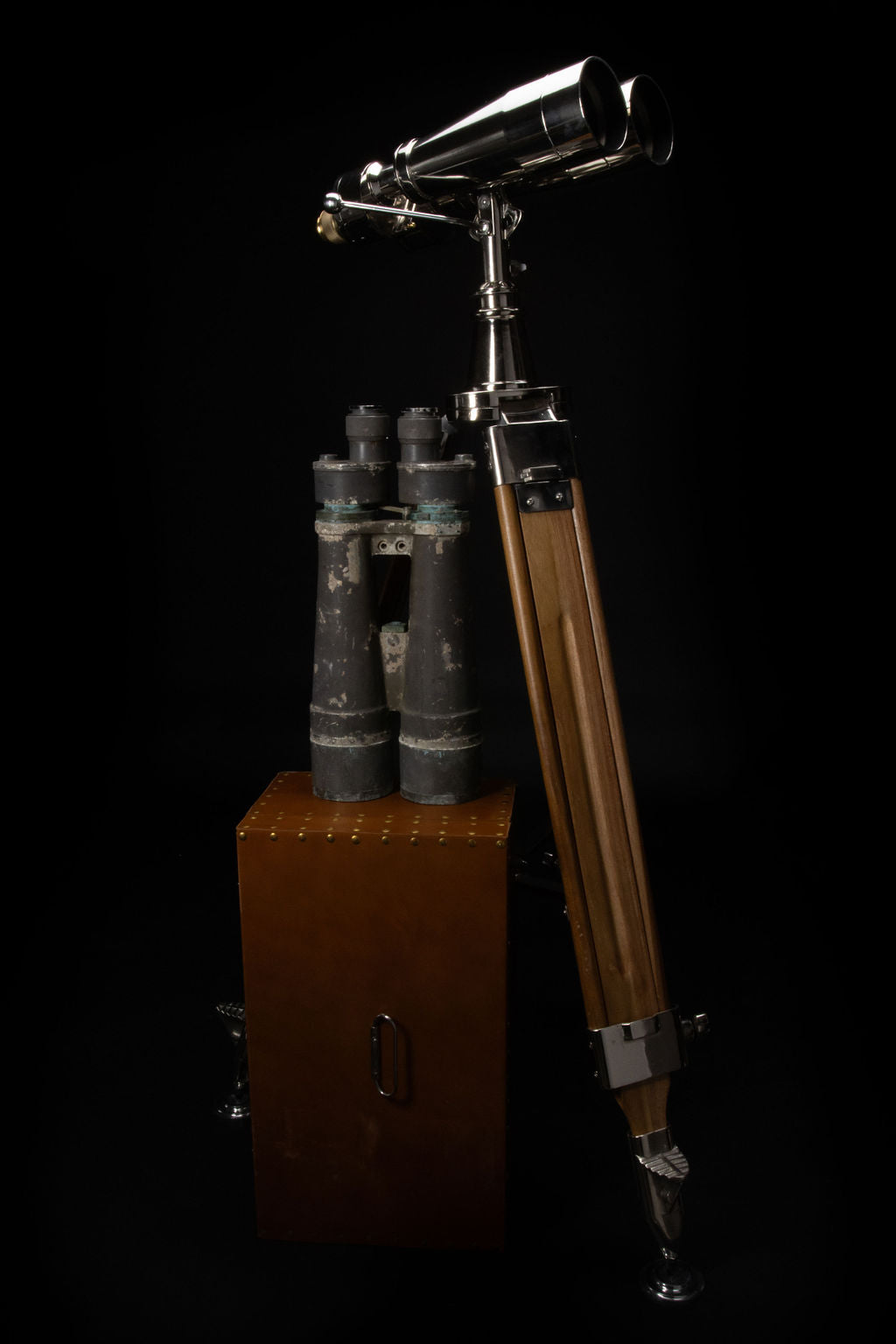 Nikon marine binoculars mounted on a wooden period tripod, these exceptional binoculars display entirely Original optics in a distinctly Japanese bulletproof straight-body instrument with 15 x magnification with 80 mm objective naval lens that have been originally restored in a time-consuming process to reveal a crystal clear Image. Each Binocular has a story to tell, as these were used defensively by the Navy, and are very rare due to the fact that most found their fates at the bottom of the sea. This particular pair was on a Japanese destroyer, one of the most formidable destroyers of the World War II era. They only allotted one pair of binoculars per destroyer, making these Binoculars highly sought after. A stunning centerpiece for any home or office, each binocular has its own unique serial markings, which means no one else in the world except you would own this incredible, one of a kind, collectible piece.