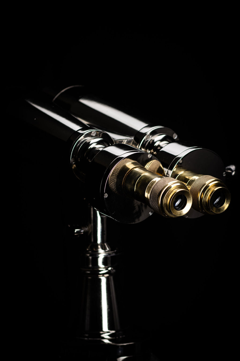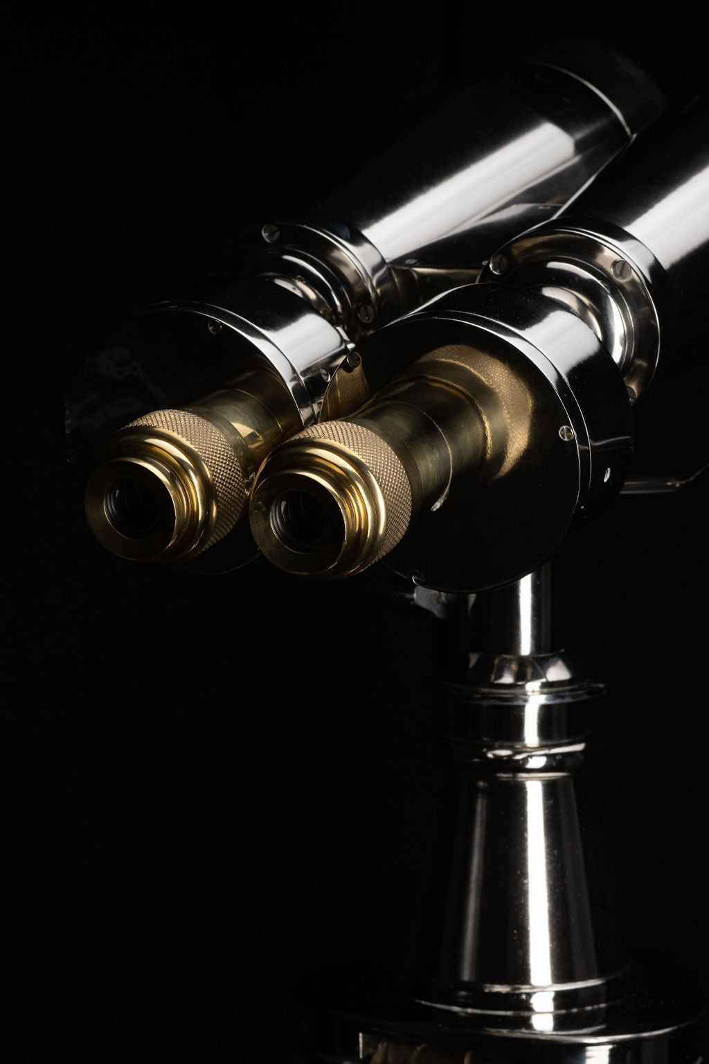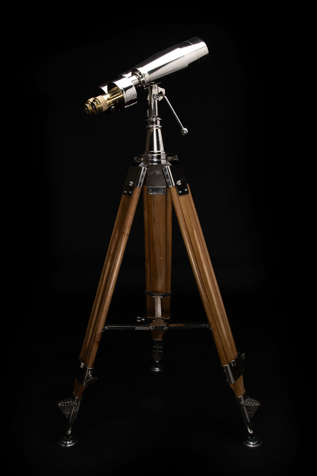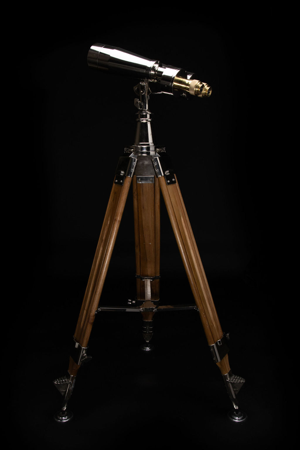 Nikon marine binoculars mounted on a wooden period tripod, these exceptional binoculars display entirely Original optics in a distinctly Japanese bulletproof straight-body instrument with 15 x magnification with 80 mm objective naval lens that have been originally restored in a time-consuming process to reveal a crystal clear Image. Each Binocular has a story to tell, as these were used defensively by the Navy, and are very rare due to the fact that most found their fates at the bottom of the sea. This particular pair was on a Japanese destroyer, one of the most formidable destroyers of the World War II era. They only allotted one pair of binoculars per destroyer, making these Binoculars highly sought after. A stunning centerpiece for any home or office, each binocular has its own unique serial markings, which means no one else in the world except you would own this incredible, one of a kind, collectible piece.