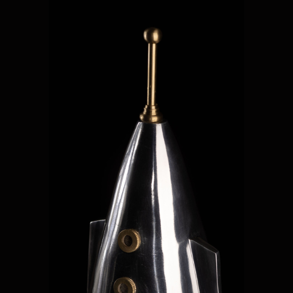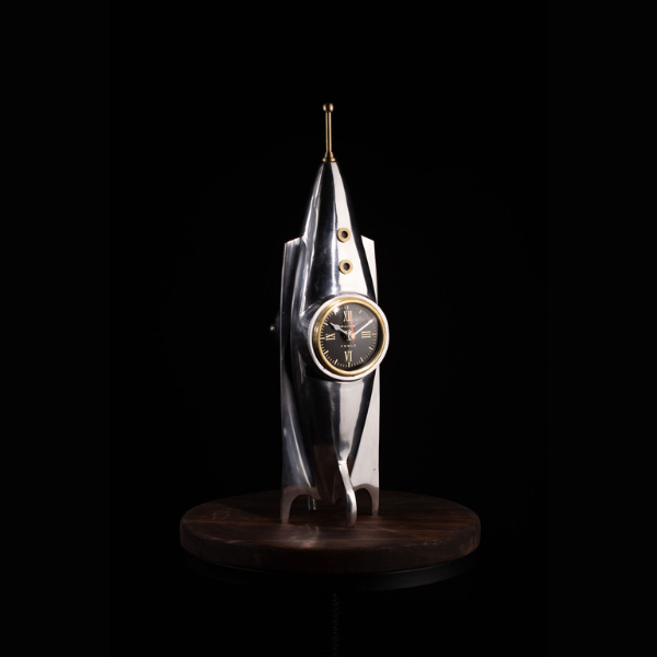 An icon from the birth of the space age, This Space X Rocket Clock houses a retro 1950s dial and hand amidst sleek lines of polished aluminum and brass. An homage to SPACE X FALCON 9 for its 87 launches completed. This retrofuturistic display stands 17” with antenna and hatches windows on three sturdy legs.