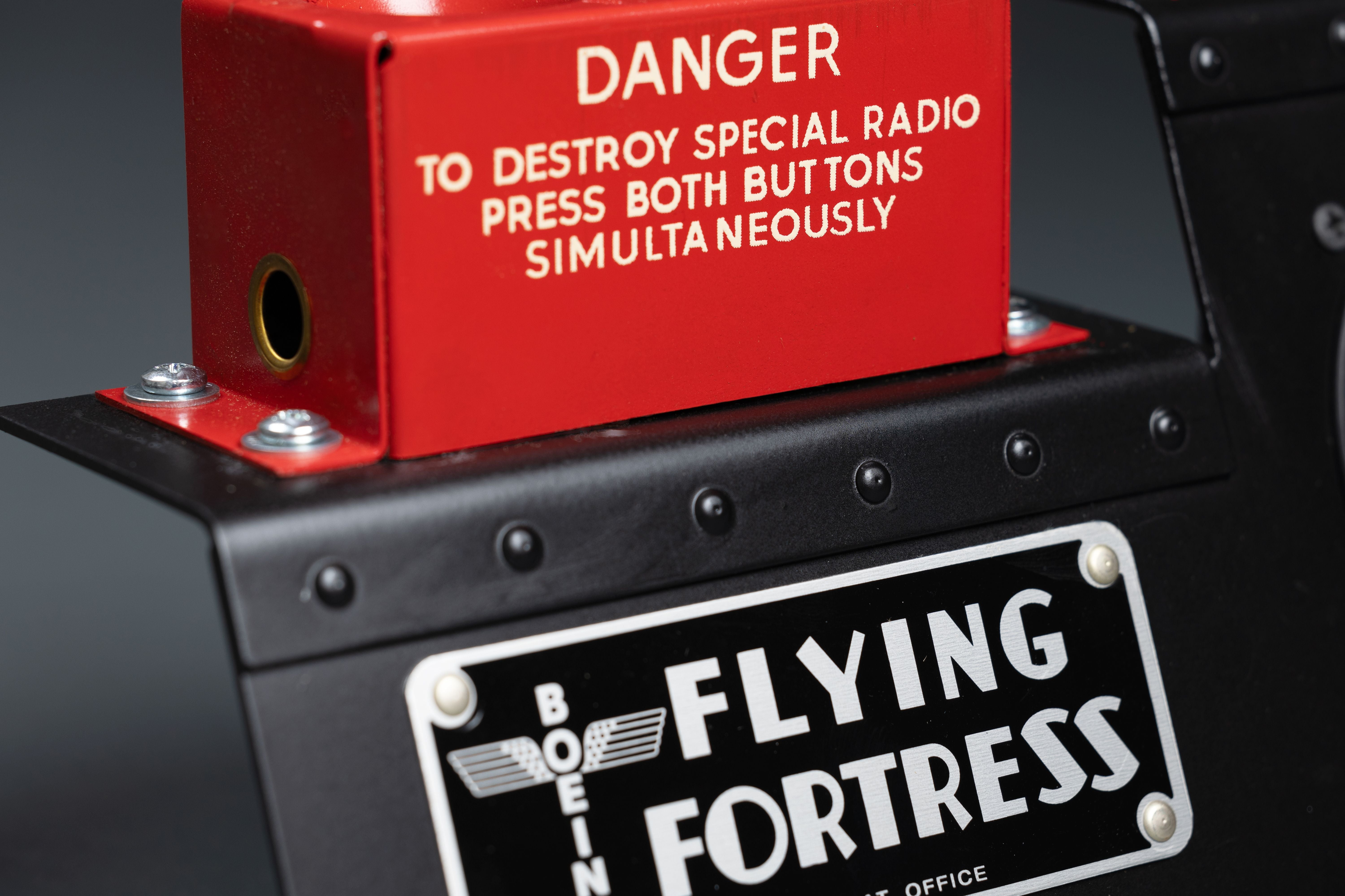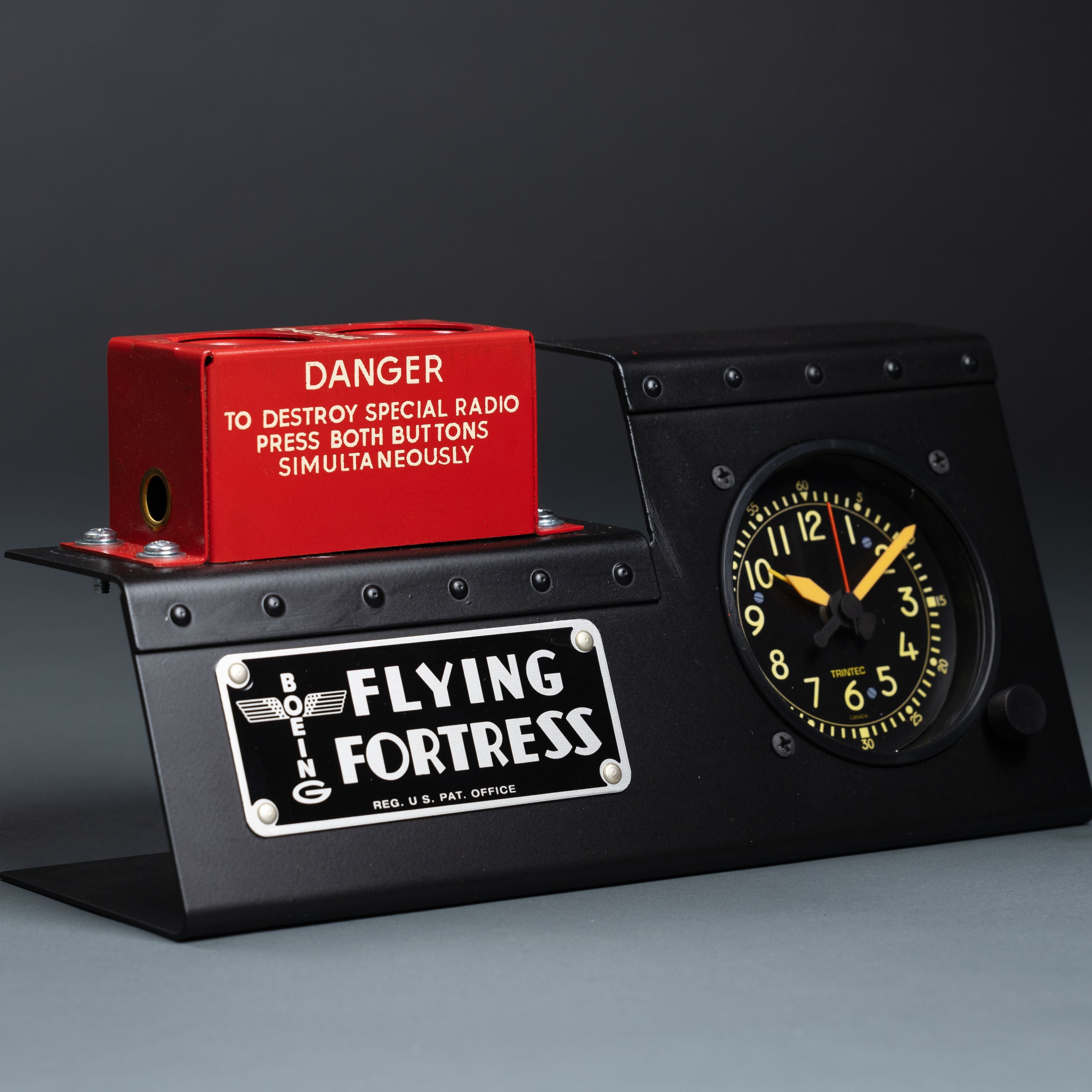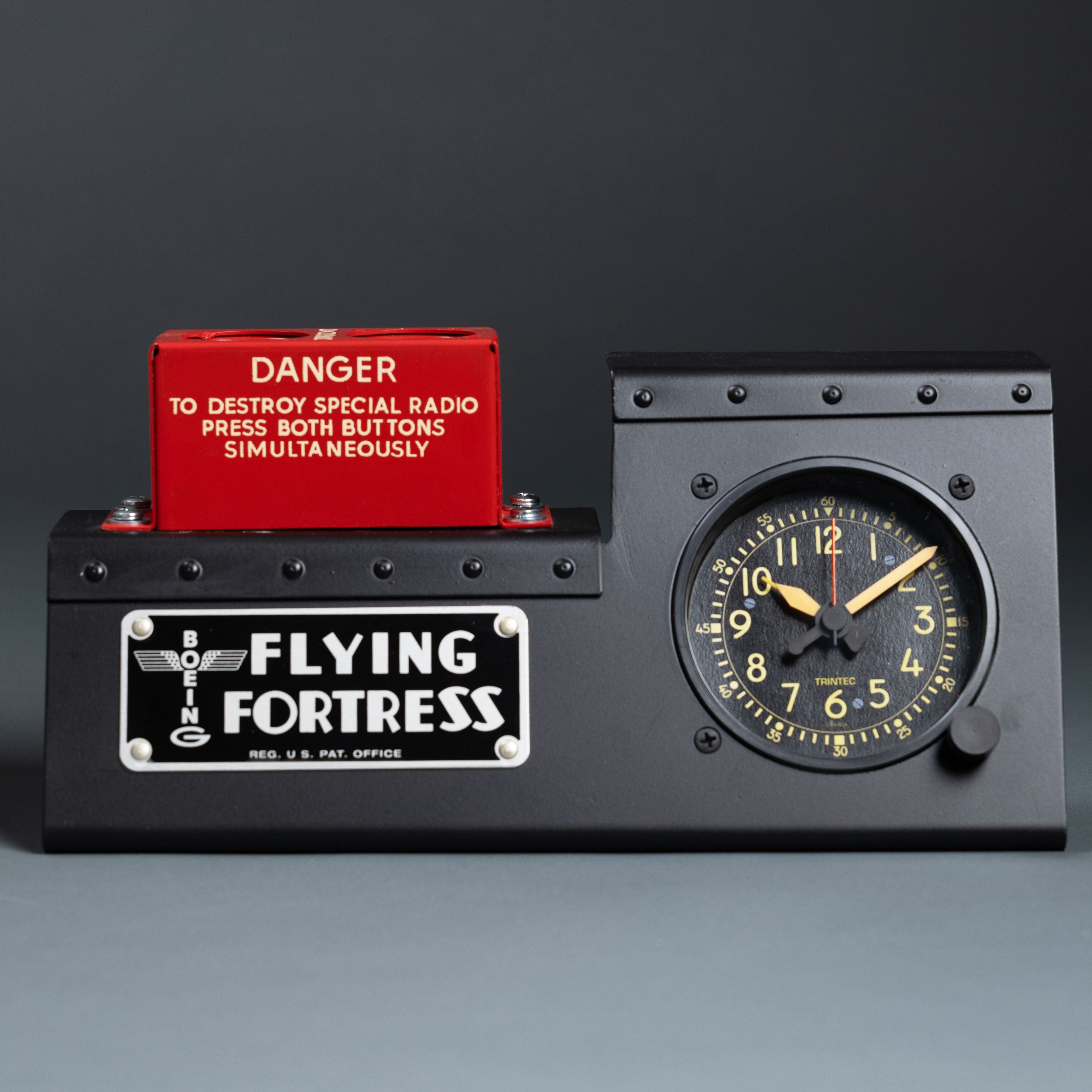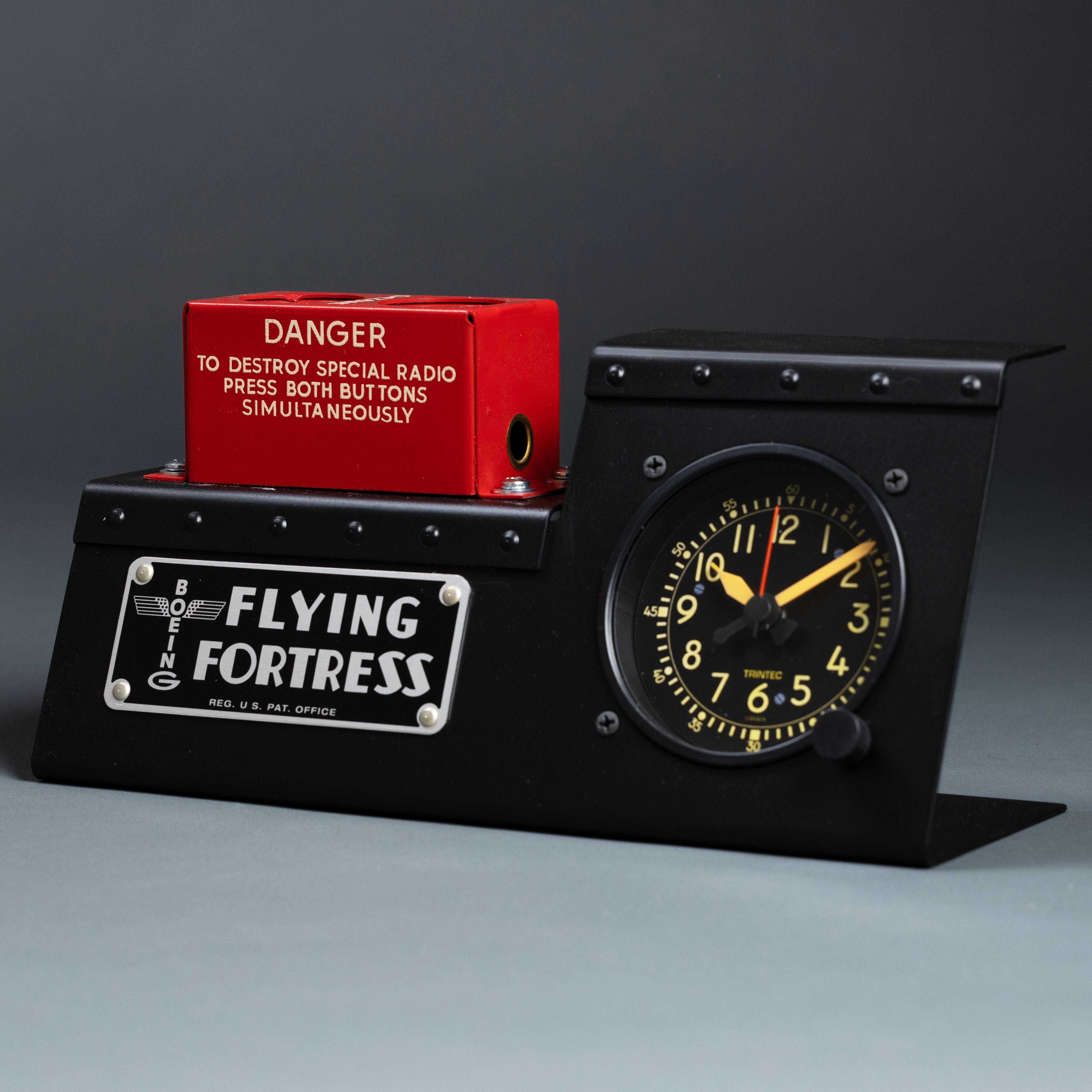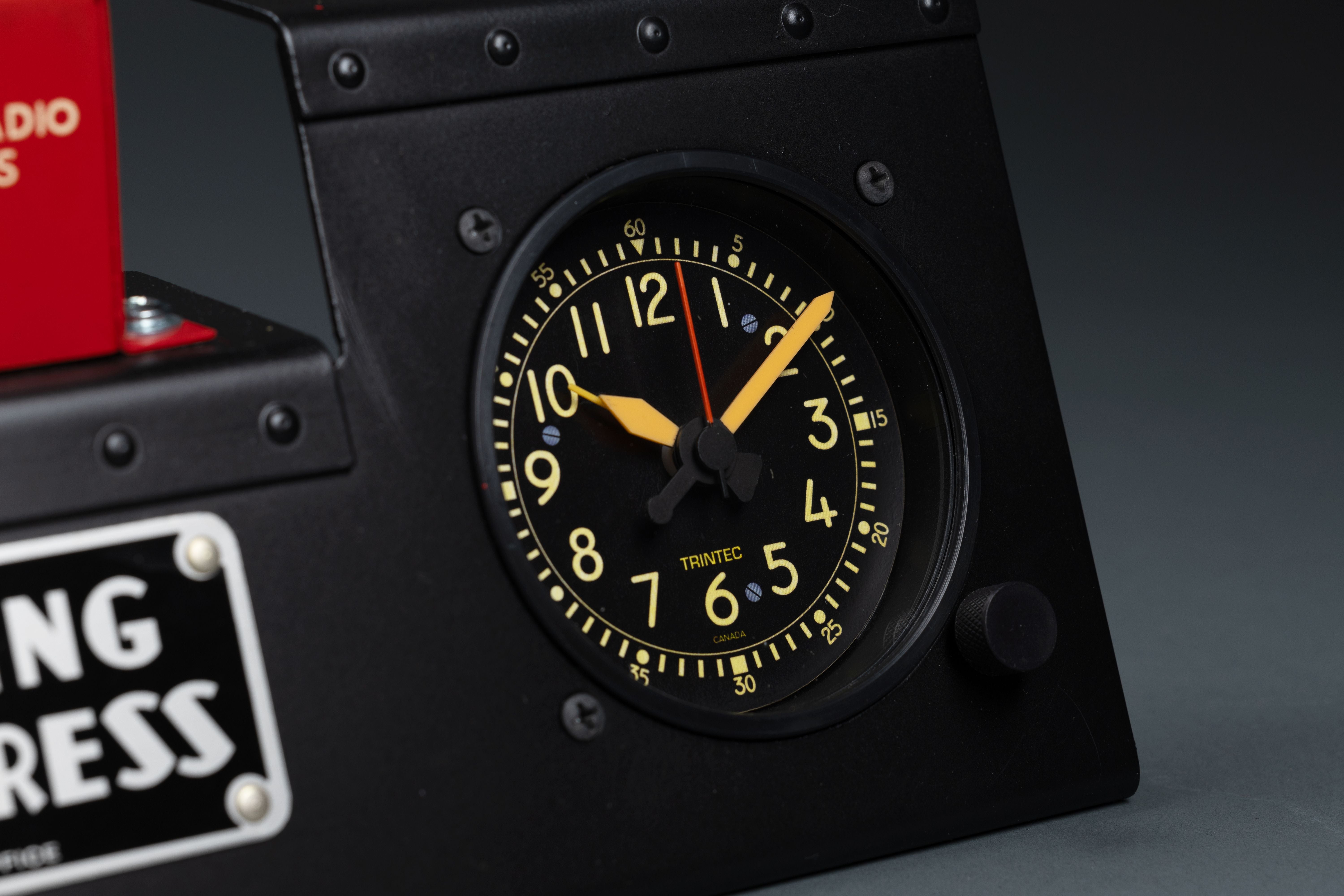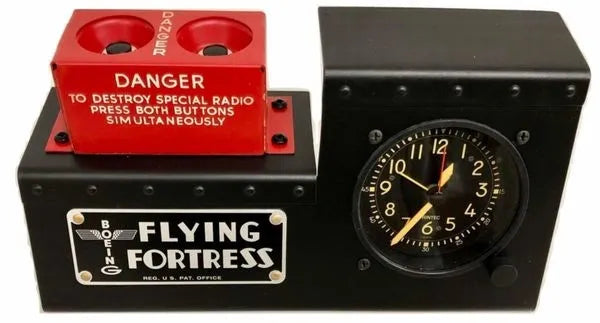 The B-17 Flying Fortress Radio Destruct/Cockpit Clock Desk Set is a unique and eye-catching conversation piece that is perfect for any aviation enthusiast. The set includes a cockpit-style alarm clock and a radio destruct switch box, both of which are hand-built by craftsmen in our aircraft restoration hangar.The cockpit-style alarm clock is made of metal and features a U.S. made quartz movement. It has a large, easy-to-read display and a loud alarm that is sure to wake you up in the morning. The radio destruct switch box is a 76+ year-old new old stock WWII relic. It is a unique and rare piece of aviation history that is sure to impress your guests.The B-17 Flying Fortress Radio Destruct/Cockpit Clock Desk Set is the perfect way to show your love of aviation and history. It is also a great gift for any pilot, aviation enthusiast, or military veteran. From a WWII Navy Radar Operator’s Manual: “There is always the possibility of aircraft being forced down or shot down with the ABK itself still in an undamaged or repairable condition. To guard against this contingency, a detonator is installed in every ABK unit. This detonator or "destructor" is an explosive charge inserted into the side of the cabinet. When exploded, it can destroy the insides of the unit so completely that it is impossible for the enemy to determine what the resulting wreckage originally was. Composed of thermite, the charge can be set off without rupturing the case, and though the terrific heat melts everything already blown up, it cannot injure the pilot who sets it off nor can it damage or set fire to the plane. It does a thorough job of guarding the security of this important IFF unit. “The designers made certain that the detonator would function regardless of the fate of the crew of the airplane. The pilot has two switches to push to explode the demolition charge if he must land on hostile ground, so that the foe is rewarded only with a picture of destruction when he attempts to investigate IFF. If all the crew are killed, an impact switch does the job for them. It sets off the destructor when the plane crashes.